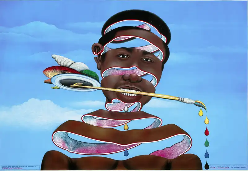 Chéri Samba is a Congolese painter and one of the most influential figures in contemporary African art, born on December 30, 1956, in Kinto M’Vuila in what is now the Democratic Republic of the Congo. He grew up as the eldest of ten children in a family rooted in traditional Kongo culture, but at age 16 he left his village for Kinshasa, the capital, to earn a living as a sign painter — a formative experience that brought him into close contact with visual communication, bold graphic styles, and fellow self-taught artists like Moké and Bodo.
